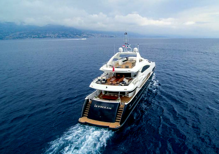 The 37 metre yacht Devocean comes with a crew of 8. The most striking features of this yacht is the exquisite interior design. The yacht combines comfort and luxury with sophistication. The Yacht’s black granite surfaces coupled with soft brown furnishes give the yacht a stylistic edge over many other luxury yachts in Monaco.